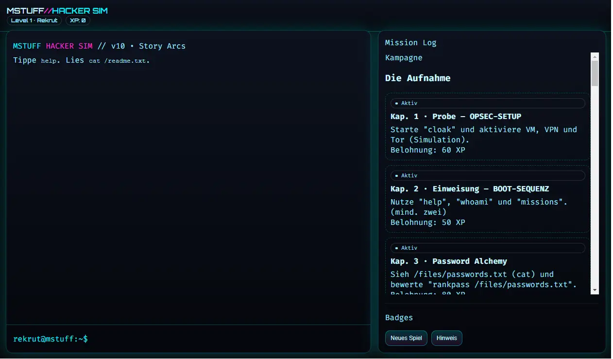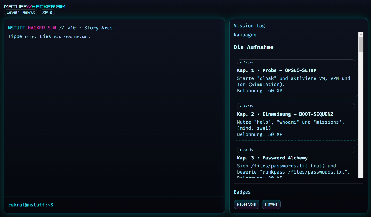MStuff: Hacker Sim ist ein textbasiertes Cyberpunk-Game, das dich in die Rolle eines Rekruten bei einer fiktiven Anonymous Cell versetzt. Dein Mentor Guid0 begleitet dich Schritt für Schritt durch spannende Missionen und realistische Szenarien.