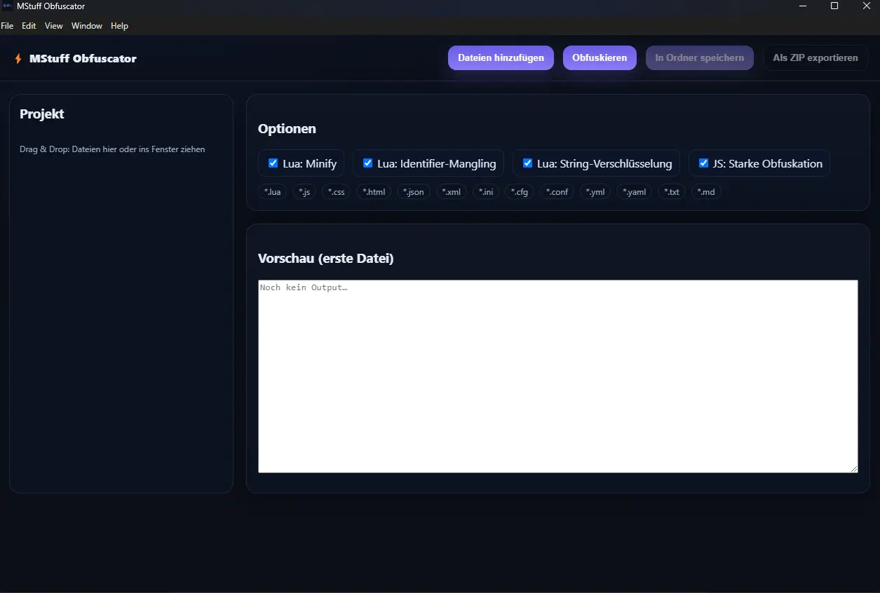 Genau dafür gibt es den MStuff Obfuscator: eine schnelle, benutzerfreundliche Software, die deine Dateien so umwandelt, dass sie weiterhin funktionieren – aber für andere praktisch unlesbar werden.