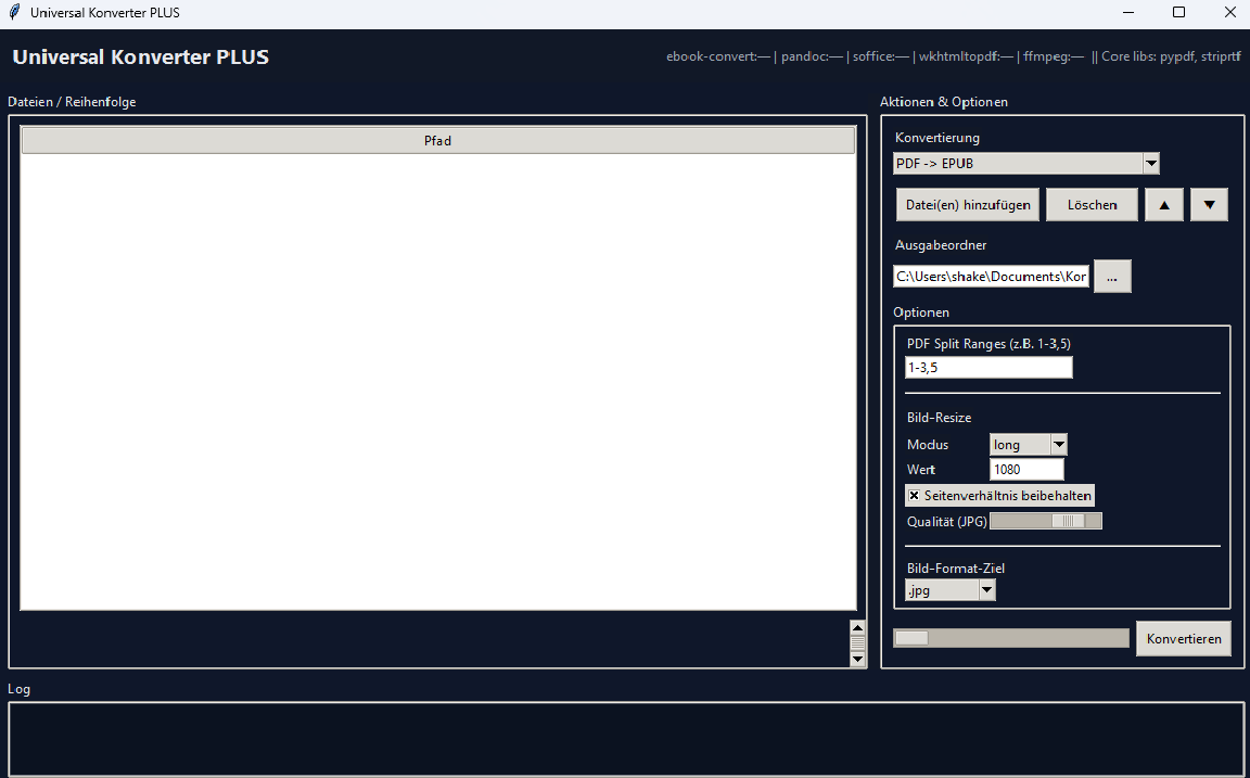 • Optional automatisch (falls vorhanden): Calibre, Pandoc, LibreOffice, wkhtmltopdf, ffmpeg